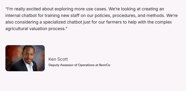 Ken Scott, Deputy Assessor of Operations, explained: "CustomGPT.ai has continually impressed us. Our own assessor loves it and frequently comments on how it provides the right answers. It's a very valuable tool that people need to understand and utilize."