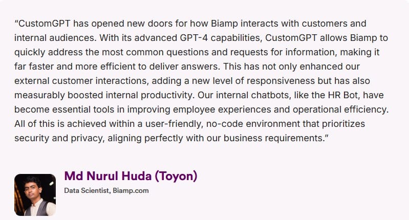 According to Biamp's team, "CustomGPT has opened new doors for how Biamp interacts with customers and internal audiences. Our CustomGPT has not only enhanced our external customer interactions, adding a new level of responsiveness but has also measurably boosted internal productivity."
