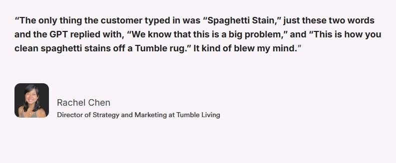 Rachel Chen, Director of Strategy and Marketing at Tumble, shared an impressive example: "The only thing the customer typed in was 'Spaghetti Stain,' just these two words and the GPT replied with, 'We know that this is a big problem,' and 'This is how you clean spaghetti stains off a Tumble rug.' It kind of blew my mind."